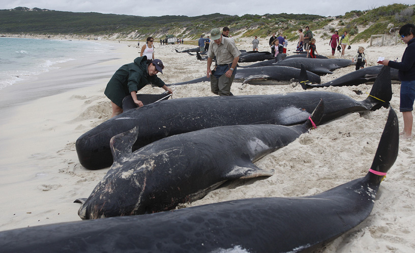 Rescuers gather information from dead long fin pilot whales at Hamelin Bay on March 23, 2009. 58 Volunteers joined rescue workers struggling to save the lives of 17 whales that survived a mass stranding on a beach on Australia’s west coast, officials said Around 80 long-finned pilot whales and bottlenose dolphins were found beached over more than five kilometres (three miles) in Hamelin Bay, south of the city of Perth. “When found this morning there were 25 whales alive, since then a further eight have died,” the Department of Environment and Conservation said in a statement. AFP PHOTO/Tony ASHBY (Photo credit should read TONY ASHBY/AFP/Getty Images)