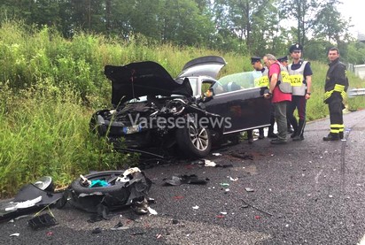 Poniamo il caso che Buonanno non abbia allacciato le cinture di sicurezza. Bisognerebbe chiedersi allora di chi sia il corpo ricoperto da un drappo sull’asfalto, fotografato alcuni metri prima della VW Beetle, subito dopo il sinistro. Nel dossier fotografico vediamo due auto. Una delle due è il veicolo di Buonanno, mezzo che avrebbe tamponato la vettura tre volumi. Dalle immagini a disposizione notiamo come i danni causati alla parte anteriore del Maggiolino corrispondono, secondo i crash test dello stesso modello di automobile, ad una velocità di impatto di circa 65 Km/h contro barriera fissa ed a conseguenze che, come emerge chiaramente dai fotogrammi, non sono assolutamente compatibili con una morte sul colpo, tanto meno per chi è alla guida! Infatti la cella di sicurezza dell’abitacolo è intatta. Così pure la portiera, che ha ancora le cerniere perfettamente integre e che quindi può essere regolarmente aperta senza difficoltà (Lo si vede anche dagli scatti di Varese News).