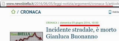 Su Newsbiella.it la notizia dell’incidente, occorso a Gianluca Buonanno, viene pubblicata alle 10:50 del mattino. Successivamente l’articolo viene modificato, spostando l’orario al pomeriggio ed eliminando il dettaglio dell’investimento ad opera di altro veicolo. Ma resta l’orario di prima pubblicazione! Doti di preveggenza o manipolazione della cronaca?