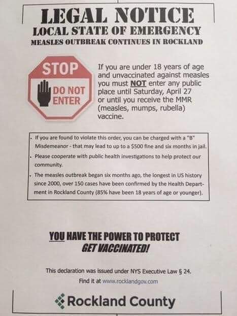 Che ai minori di 18 anni fossero vietate un mucchio di cose lo sapevamo ma questa segna una nuova frontiera. Ciò che si legge in questa immagine è un ordinanza di divieto, ai minori di 18 anni, di frequentare per oltre un mese qualsiasi luogo pubblico a causa di una “epidemia” di morbillo. Pena un’ammenda di oltre 500$ ed il carcere. Vorrei far notare una serie di particolari.