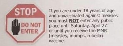 Che ai minori di 18 anni fossero vietate un mucchio di cose lo sapevamo ma questa segna una nuova frontiera. Ciò che si legge in questa immagine è un ordinanza di divieto, ai minori di 18 anni, di frequentare per oltre un mese qualsiasi luogo pubblico a causa di una “epidemia” di morbillo. Pena un’ammenda di oltre 500$ ed il carcere. Vorrei far notare una serie di particolari.