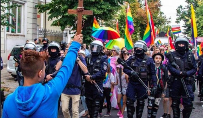 Ma di certo sarebbe molto difficile vederli di fronte ad un cordone di polizia, crocifisso alzato, ad affrontare, da soli l’avanzata eterofoba del gay pride polacco. Per poi essere allontanati, nientemeno che dalle forze ordine, che dell’ordine nemmeno hanno più il concetto, essendo l’omofilia sessuale un concetto di disordine. In un mondo equilibrato sarebbe dovuto accadere il contrario…