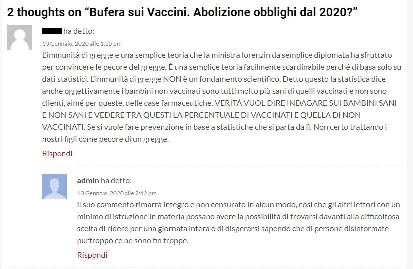 Notiamo che a d oggi, il sito contraffatto riporta una dozzina di commenti tutti inopinabilmente contrari all’obbligo vaccinale. Ma rileviamo anche che il commento dell’amministratore postato il 10 gennaio 2020 alle ore 2.42pm (vedi foto in galleria) è stato rimosso e gli “alert” malware sono spariti. Il nostro consiglio resta sempre di verificare l’attendibilità di un sito web a prescindere dalle notizie pubblicate.