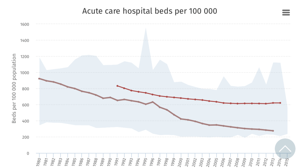 Il coronavirus infatti c’insegna anche questo: ad oggi siamo in una situazione tale che i nostri (insisto sul nostri perché queste strutture PUBBLICHE le abbiamo costrutite coi noi nostri soldi, CONE LE TASSE che ci vengono trattenute dallo stipendio tutti i mesi) posti letto per la terapia intensiva sono poco più di 5mila, sembrano tanti? No. Capite dunque perché la classe politica si prodiga con l’emanazione di norme sempre più stringenti? Temono il collasso del Sistema Sanitario Nazionale, temono… loro. Ma qualcuno lo auspica da tempo sennò come si spiegano questi dati? Nei grafici sottostanti si palesa inequivocabilmente la demolizione controllata della sanità (di cui abbiamo accennato qui) avvenuta sotto i nostri inconsapevoli nasi durante gli ultimi 30 anni: