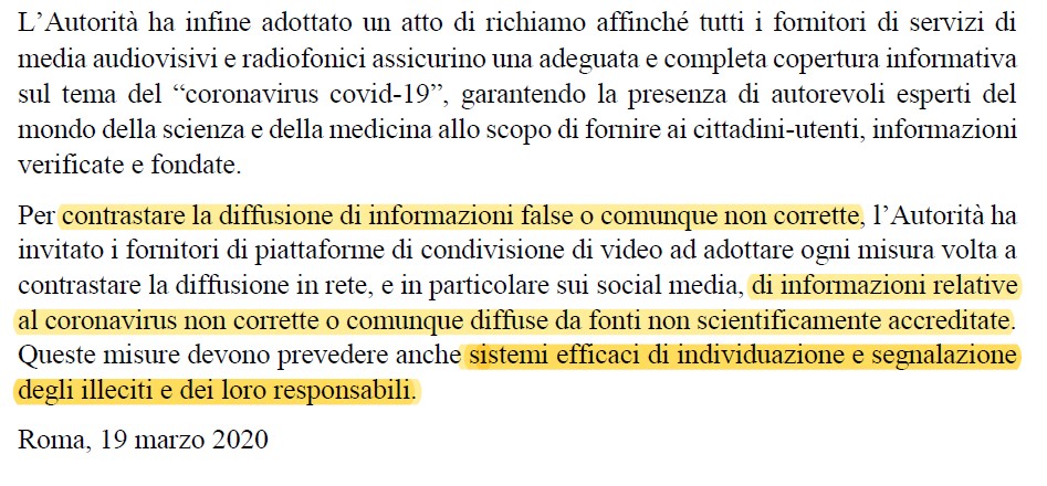Ma probabilmente questi canali di controinfomazione sono solo una fucina di pseudo teorie complottiste e le risposte vanno ricercate solo ed esclusivamente sui canali canonici e storicamente accettati tanto che l’AGICOM, L’Autorità per le Garanzie nelle Comunicazioni, in un comunicato stampa del 19 marzo 2020 incita senza mezzi termini a denunciare siti di controinformazione in puro stile dittatoriale: