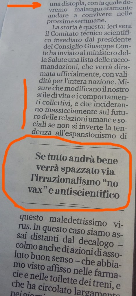 Da più fonti si sentono voci che sperano nell’intervento salvifico di un vaccino e altri ancora non risparmiano gratuite invettive nei confronti di chi ha fatto una libera scelta in merito all’obbligo vaccinale (vedi foto a lato). Quindi l’hashtag #andràtuttobene serve anche a questo? a convertire i fanatici no.vax?