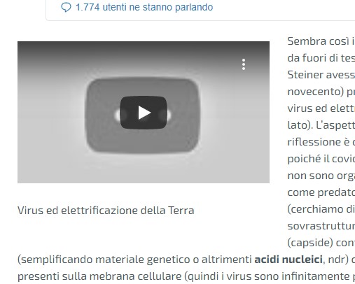 Sembra così incredibile che diventa addirittura da fuori di testa pensare che un certo Rudolf Steiner avesse già a suo tempo (primi del novecento) previsto la deleteria relazione tra virus ed elettrificazione della terra (vedi video a lato). L’aspetto affascinante di questa riflessione è che la cosa è del tutto plausibile poiché il covid-19, ma tutti i virus in generale, non sono organismi viventi che vanno in giro come predatori a caccia della loro preda (cerchiamo di eliminare questi preconcetti sovrastrutturali) ma un agglomerato proteico (capside) contenente DNA ed RNA (semplificando materiale genetico o altrimenti acidi nucleici, ndr) che attraverso dei recettori presenti sulla mebrana cellulare (quindi i virus sono infinitamente più piccoli di una cellula, ricordiamolo quando usiamo una mascherina di fortuna o magari fatta con una sciarpa o peggio con toppe di tessuto, leggi anche qui) viene inglobato con un processo detto di endocitosi.