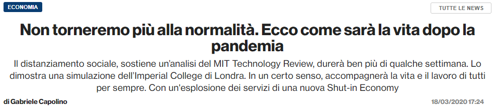 E non solo, perché se qualcuno ha ancora orecchie per ascoltare non avrà potuto fare a meno di notare che da più parti, da Ricciardi – AIFA – fino ai finanzieri di Milano finanza Già da metà marzo e anche prima ci stanno ammaestrando a una “nuova normalità“: