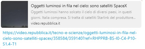 Ultima ma non per questo meno importante è una recente notizia riguardante l’avvistamento di strane luci che attraversano la volta celeste della bassa padana che i media riconducono allo “spettacolo” dei satelliti Starlink di Space X di Elon Musk.
