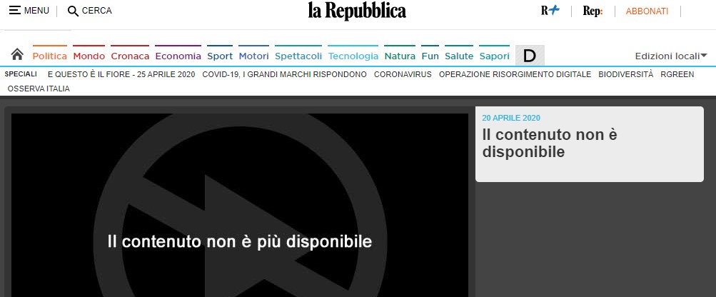 Mentre il giorno dopo – 21/4/2020 – viene pubblicato il seguente articoletto con video annesso: