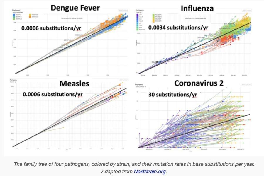 Qui possiamo vedere come mutano (substitutions/yr – mutazione per anno) i virus più conosciuti nel tempo. Si parte dalla febbre di dengue, in alto a sinistra, malattia tropicale naturale, endemica di certe aree geografiche, trasmessa dalle zanzare alla quale ci stanno già ammaestrando da anni (vedi finestra di Overton, ndr) con sempre più numerosi ed allarmistici messaggi relativi al fatto che preso o tardi dovremo vaccinarci anche per questa terribilissima malattia che arriverà presto da noi, pensate un pò, a causa del surriscaldamento globale. Poi c’è la classica influenza naturale per passare al morbillo, anch’esso naturale, e finire col coronavirus (stavo per fare una battuta ma ho troppo rispetto per le vittime innocenti di questa tragedia sanitaria), ovvero sars-cov-2 che dalle numerose mutazioni (ad oggi siamo ad oltre 30, ndr) si può dedurre che forse forse non è tanto naturale come virus ma un pochetto artificiale lo è, giusto quel pò da renderlo molto virulento alla bisogna, visto che la Natura lo sta già castigando costringendolo a trovare un suo equilibrio naturale, poiché di naturale ha ben poco. Sto “avvelenando il pozzo”? Instillo il dubbio cattivo che stimola il ragionamento come cura alla cerebrolesità? Spero di si allora perché questo virus, della famiglia dei coronavirus, ci è stato presentato come covid-19, così, tanto per farci ricordare che è “nato” nel 2019 e quindi potremo disitinguerlo dai prossimi che verranno. Si, so che ho scritto, perché ritengo ce ne saranno altri a partire dal “ritorno di fiamma” del nostro covidino che avverrà ad ottobre e per il quale, anche se non ce lo dicono ancora apertamente, stanno già preparando un prolungamento dello stato di emergenza e state sicuri che è così che deve andare non solo per noi ma a livello globale, perché la regia è unica e se vogliamo stare sicuri e tornare alle nostre vite “di prima” dovremo ubbidientemente vaccinarci tutti, è Bill Gates che lo raccomanda! Nota ed autorevole personalità della medicina mondiale… no degli antivirus… no quelli no, sono dei pc… Bill Gates… windows… pc… virus…. antivirus… vaccini… id2020… uff, voglio scendereeee!!!