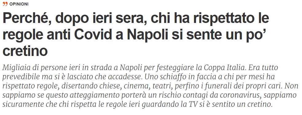 “Sciagurati! In questo momento non ce lo possiamo permettere” e aggiunge “per fortuna è accaduto a Napoli, dove governatore e sindaco hanno messo in atto misure rigide e l’incidenza del virus è più bassa che altrove“
