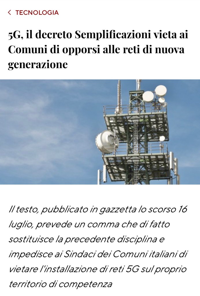Nonostante ciò è stato decretato che i Comuni non potranno opporsi visto il crescente numero di moratorie che ne bloccava l’installazione (c’è stata anche un morte avvenuta in circostanze sfortunate proprio a uno dei primi sindaci che si sono opposti all’uso della nuova tecnologia leggi qui → Rocca di Papa. Il Sistema torna a uccidere?)
