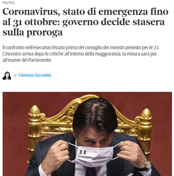 “L’eventuale proroga dello stato di emergenza viene ritenuta necessaria per snellire le procedure sull’acquisto del materiale indispensabile per la ripartenza della scuola (banchi, mascherine, test sierologici), rinnovare il Dpcm e le ordinanze di protezione civile.” [fonte]