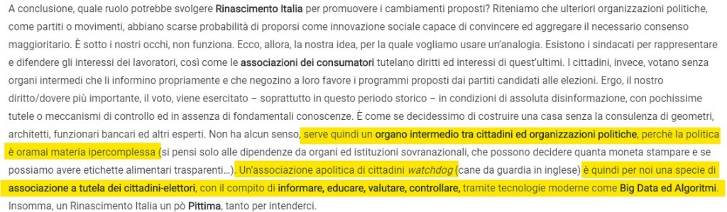 la più grande federazione italiana di associazioni civiche, associazioni a tutela di categorie di cittadini e di cooperative italiane e diretta da personaggi più o meno noti della società civile, medica e giuridica del paese e visibili sul sito, che è praticamente il manifesto di quelli che la stampa mediatica predominante etichetta come -isti (complottisti, negazionisti, etc.) e non c’è argomento che non venga trattato in maniera controversa e, per così dire, non allineata. Si va dai vaccini, alla scuola, dall’economia alle libertà sociali e altro ancora, proponendo una serie di azioni (come la lettera a Conte) e proteste tese alla riappropriazione delle proprie libertà che, in un modo o nell’altro si stanno perdendo irrimediabilmente e che tale processo è descritto (vedi qui) come inevitabile in un immediato prossimo futuro, precisamente entro il 2030 che è anche la scadenza dell’Agenda 2030 dell’Onu per lo sviluppo sostenibile. Per cui bisogna prepararsi ad affrontare l’ineluttabile cambiamento in atto altrimenti ne verremo travolti. A loro avviso «la tecnologia rappresenta – forse in modo controintuitivo – l’unico strumento concreto e di immediata attuabilità, per passare in modo non cruento ad una società post-capitalistica incentrata su un Nuovo Umanesimo».
