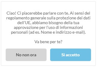 Allora mi voglio iscrivere! Solo che nel form d’iscrizione non trovo nessun specifico rimando alla legge sulla privacy o sul GDPR. Ma con un pò di attenzione si può notare un bottone più o meno anonimo in basso a destra, presente in ogni pagina, che al click mi restituisce l’immagine molto amichevole qui a lato. Oltre a ciò vi sono altri bottoni (icone cliccabili) che rimandano agli altri canali social del sito ma non trovo un indirizzo, una sede, un ente, un qualcosa che mi indichi a chi possa rivolgermi o meno, a parte un email e un numero di telefono. Va bene, ma allora a chi sto dando i miei dati personali a parte il fatto che compilando il form “Acconsento che questo sito memorizzi le mie informazioni inviate.“?