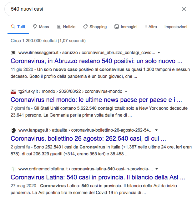 Un amico, un giorno di agosto, mi ha invitato a fare una prova simpatica, simpatica per modo di dire. Mi ha chiesto di digitare nella ricerca Google un numero qualsiasi tra 1 e 999 e aggiungere “nuovi casi”. Beh, non ci credevo; ci azzeccava sempre! C’è sempre un rimando a un articolo che riporta il numero scelto come nuovi casi di Coronavirus.