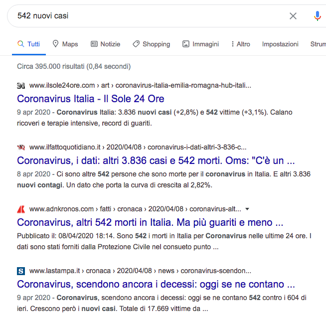 Per esempio se scrivi 123 casi coronavirus, lui ti trova tutti gli articoli dove ci sono le keywords a se stanti o correlate. Se trova 123 casi coronavirus te. Lo riporta. Tu considera che sono 5 mesi circa che vengono riportati numeri di casi giornalieri, per regioni, comuni, città ecc. quindi magari trova un articolo dove lo riporta.