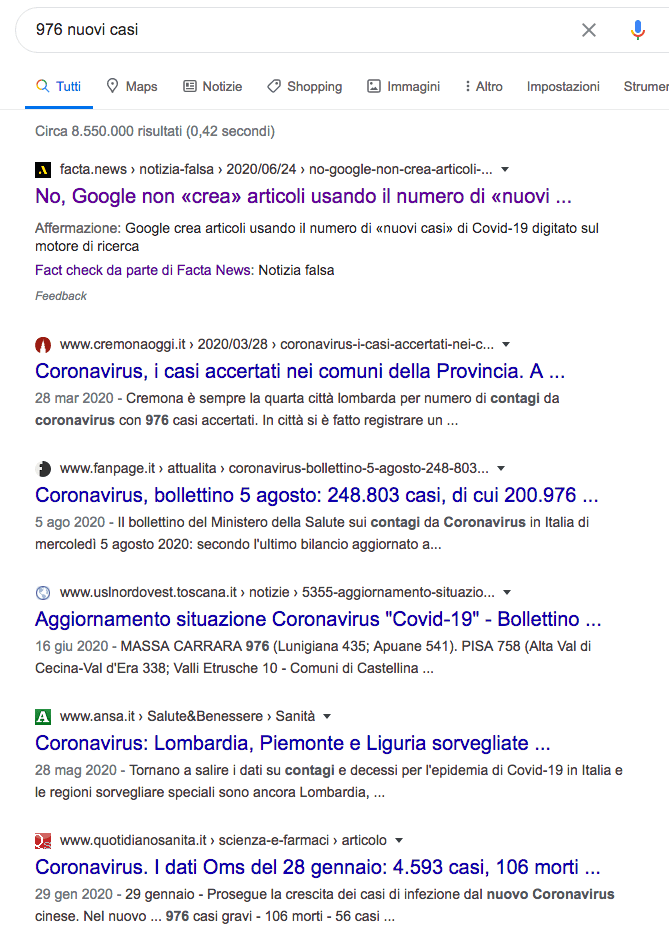 per verificarlo basta digitare su Google la chiave di ricerca (scelta in maniera casuale) 976 nuovi casi e 976 new cases che non restituisce alcun articolo contenente la sequenza di numeri e parole.