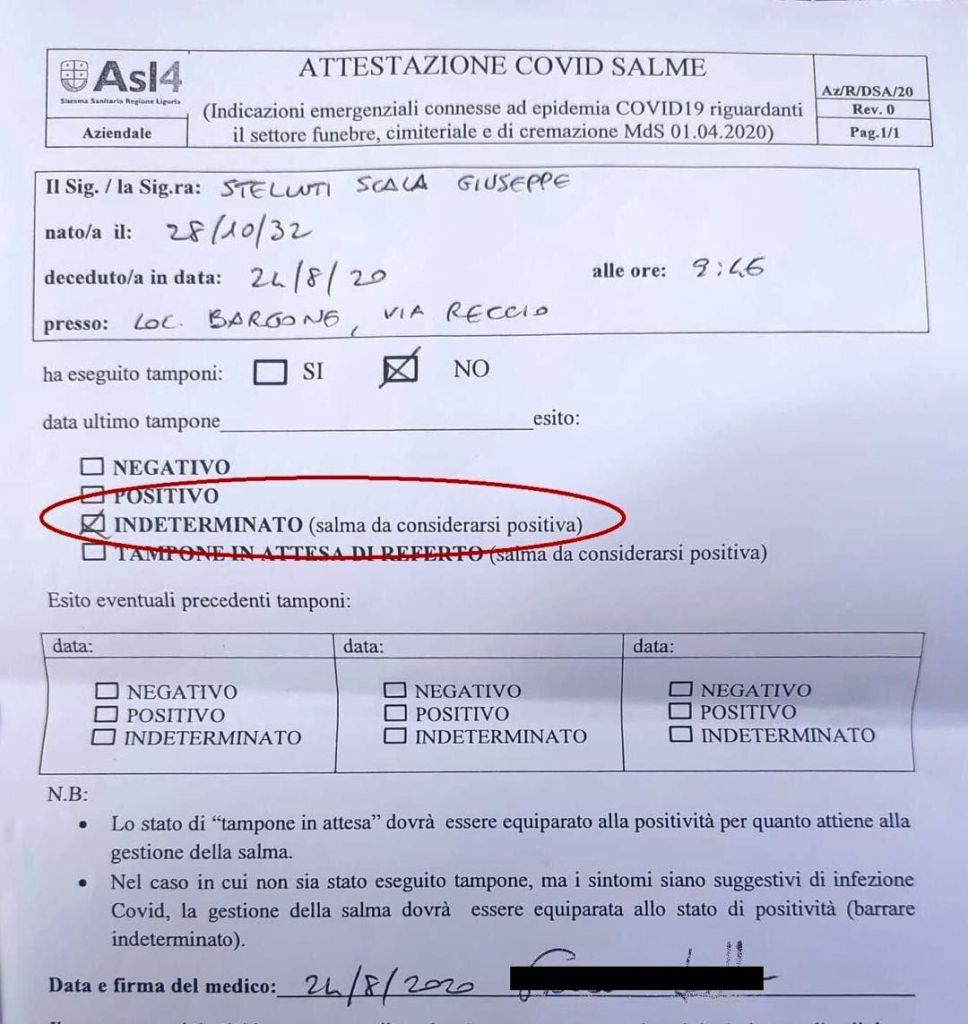 E per finire uno dei tanti documenti redatti appositamente per aumentare il numero dei decessi per il virus. Qui di seguito il sistema per definire “morti per Covid” i deceduti non verificati: