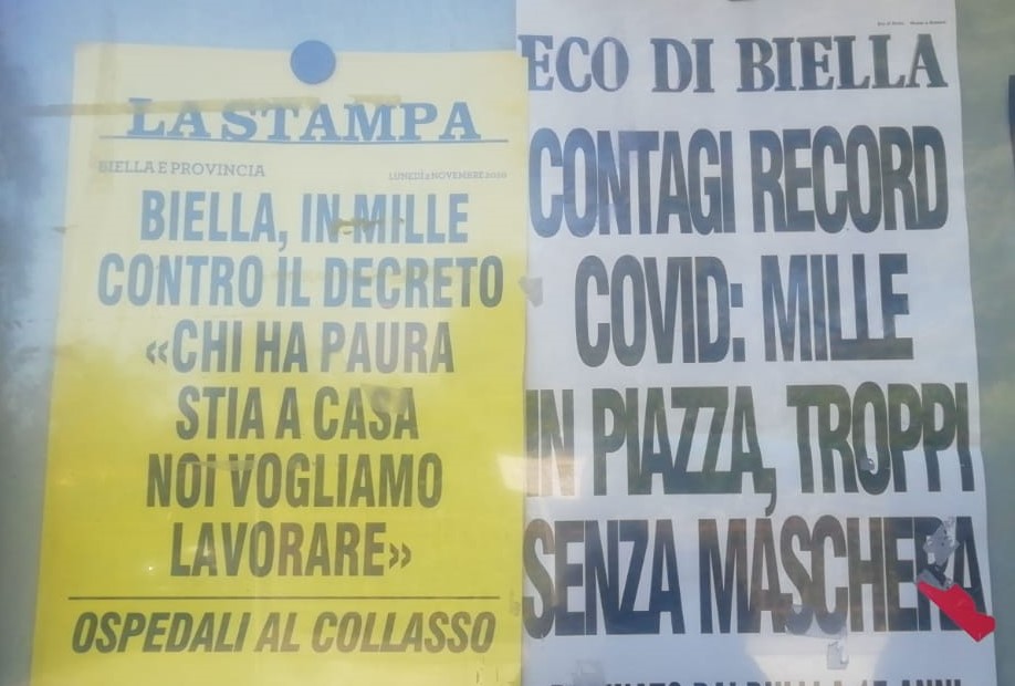 Mentre l’Eco Di Biella ci tiene a far sapere che troppi erano senza mascherina. Falso, perché la maggior parte dei presenti alla manifestazione rispettavano la “regola” scritta su un dpcm emanato da Conte I Re d’Italia conosciuto anche come Re sòla, e indossavano tutti la pezzuolina salvifica.