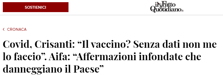 Ma l’altro punto interessante sono le affermazioni di coloro che, fino a poco, prima erano alla ribalta in tutte le televisioni, a seminare il terrore nella popolazione sulla mortalità di questo virus. I vari Roberto Burioni o Andrea Crisanti (non li chiamo “dottori” per non offendere Ippocrate) hanno recentemente fatto marcia indietro su questo vaccino e sulla sua reale affidabilità, se non addirittura sui suoi possibili, e quanto mai probabili, effetti collaterali non ancora verificati.