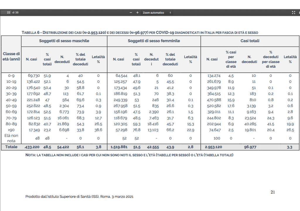 Da notare che lo stesso I.S.S. , nonostante tiri per i capelli i dati sulla mortalità, basata sul riscontro del famoso “tampone”, riporta la mortalità della fascia in età scolastica da 0 a 19 anni. Lo leggete anche voi? Quanto è? È “zero”, leggo bene? Ecco, allora le scuole non sono ambienti pericolosi e vanno tenute aperte e senza restrizioni; e non venitemi a dire “I dati sono bassi grazie alle mascherine e al distanziamento”.