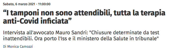 Quattro avvocati e sette cittadini italiani, contro il Ministero della Salute e l’Istituto Superiore di Sanità. Oggetto: l’inattendibilità degli esiti di laboratorio dei tamponi. Ergo, per dirla con le parole dell’avvocato Mauro Sandri, uno dei firmatari dell’atto, “il numero spropositato di falsi positivi causato dal metodo che Iss ha stabilito, contravvenendo ai suggerimenti del Cts e della stessa Organizzazione Mondiale della sanità, per definire una persona malata di Covid 19. Un numero di falsi positivi pari all’80% minimo (fonte)