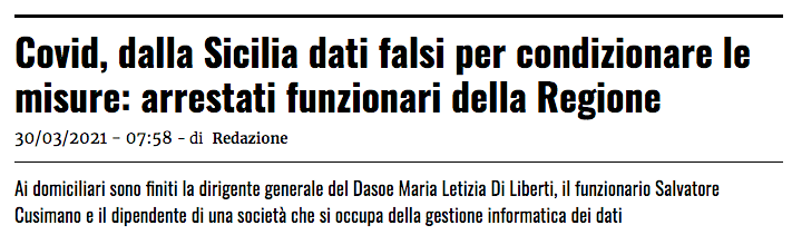 L’inchiesta nasce dalla scoperta che in un laboratorio di Alcamo (Trapani), da qui la competenza della Procura di Trapani, erano stati forniti dati falsati su decine di tamponi. I pm hanno avviato accertamenti che sono arrivati all’assessorato regionale. Diverse intercettazioni confermerebbero l’alterazione dei dati inviati all’Iss. Cioè mentre l’Isola era travolta dalla pandemia e dai contagi, la Regione comunicava a Roma dati truccati e calmierati (Continua sulla fonte)