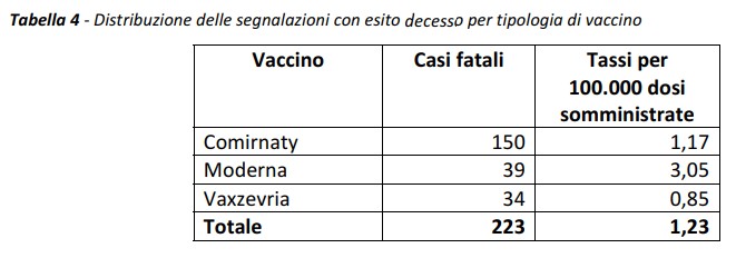 “In Italia, al 26 aprile 2021, sono state inserite 223 segnalazioni con esito “decesso”, con un tasso di segnalazione dei casi con esito fatale di 1,23/100.000 dosi per tutti i vaccini. Il 55,6% dei casi riguarda donne, il 43,4% uomini”