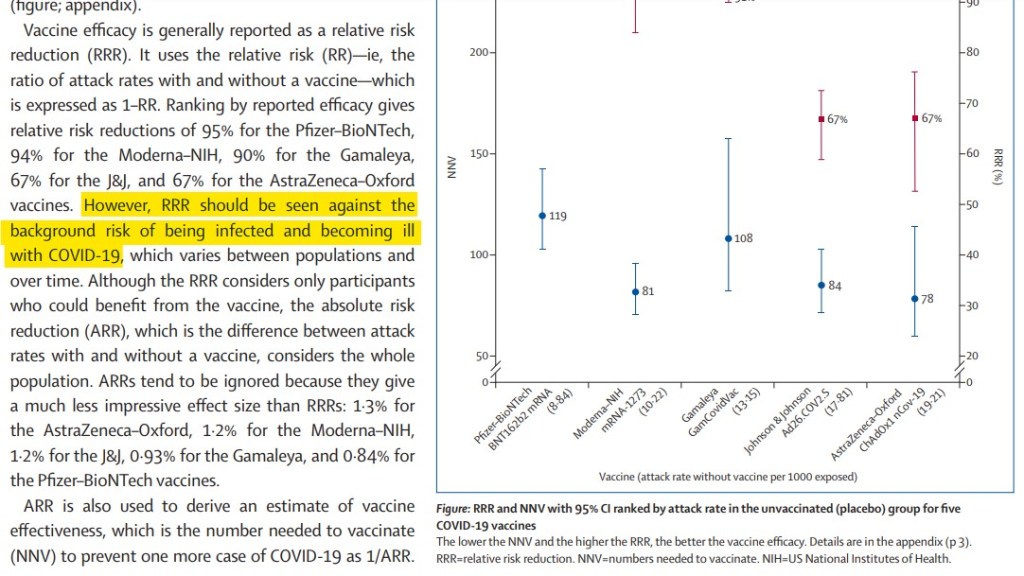 rapporto tra i tassi di attacco con e senza un vaccino, che è espresso come 1-RR. La classificazione in base all’efficacia riportata dà riduzioni del rischio relativo del 95% per il Pfizer-BioNTech, 94% per il Moderna-NIH, 90% per il Gamaleya, 67% per il J&J, e 67% per il AstraZeneca-Oxford vaccini.Tuttavia, l’RRR dovrebbe essere visto contro il rischio di fondo di essere infettati e ammalarsi con COVID-19, che varia tra le popolazioni e nel tempo. Anche se l’RRR considera solo i partecipanti che potrebbero beneficiare del vaccino, la riduzione del rischio assoluto (ARR), che è la differenza tra i tassi di attacco con e senza un vaccino, considera l’intera popolazione. Le ARR tendono ad essere ignorate perché danno una dimensione dell’effetto molto meno impressionante delle RRR: 1.3% per l’AstraZeneca-Oxford, 1.2% per il Moderna-NIH, 1.2% per la J&J, 0.93% per la Gamaleya, e 0.84% per i vaccini Pfizer-BioNTech.»