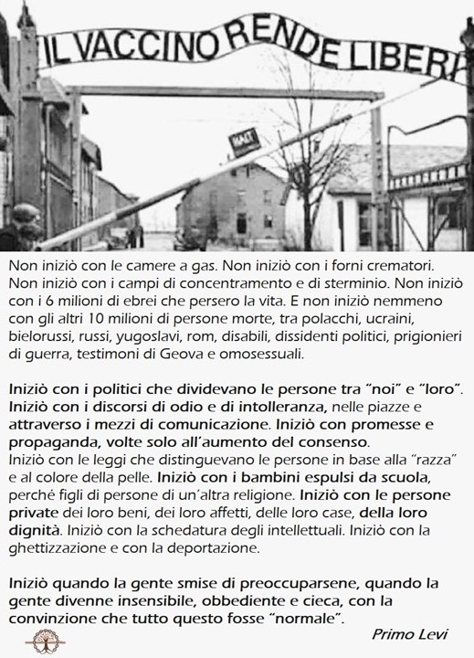 Siamo arrivati al punto che stiamo percorrendo quegli stessi binari maledetti che hanno portato l’umanità a compiere le peggio nefandezze e tutto a causa di un virus prodotto in laboratorio che è curabile nella maggiorparte dei casi, se non si radiassero quei medici che osano curare prima di ricoverare.