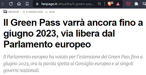 Quindi il Parlamento europeo ha votato e prorogato l’uso del greenpass fino al 2023. Certo lo so che si userà SOLO SE! ci fosse un altro stato d’emergenza, SOLO SE! il bbirus tornerà a sterminarci tutti. Certo, solo che Il Tempo riporta che la decisione è stata presa per: