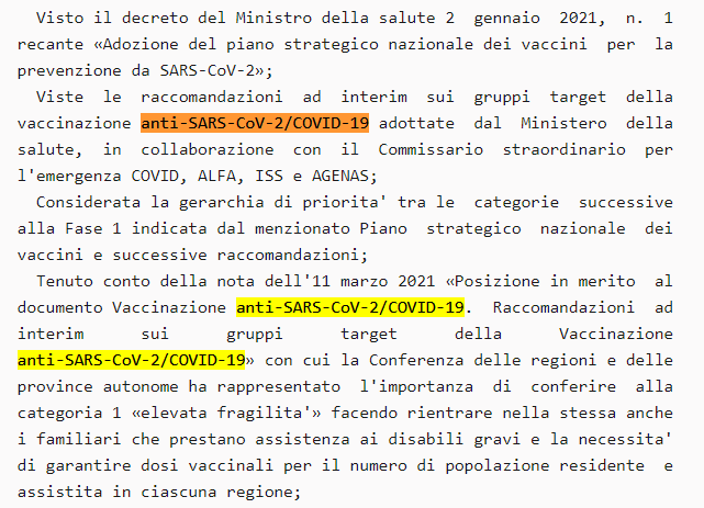 Ancora a dicembre 2020 scrivevano di “anti-sars-cov-2/covid-19” (non capivano ancora bene la differenza tra le due definizioni, nda), così si riportava nel “Piano strategico vaccinale anti-sars-cov-2/covid-19” e fino a marzo 2021 nell’Ordinanza n. 3/2021 del pennuto: