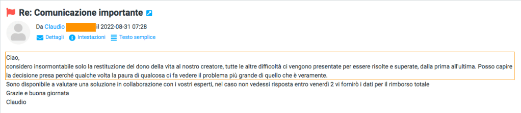 Ma quel pomeriggio del 30 di agosto una vocina mi disse che dovevo farmi lo scrupolo di richiamare ENEL per sincerarmi di quello che l’operatore il giorno prima mi aveva promesso, ossia che la pratica si era sbloccata e il contatore sarebbe stato installato in settimana. L’operatrice invece, dopo un’ora di telefonata, mi confermò che no, la pratica era incagliata e il suo collega si era palesemente sbagliato. A quel punto non avremmo avuto il tempo materiale per ottenere l’installazione del contatore, in tempo per l’impianto tecnico.