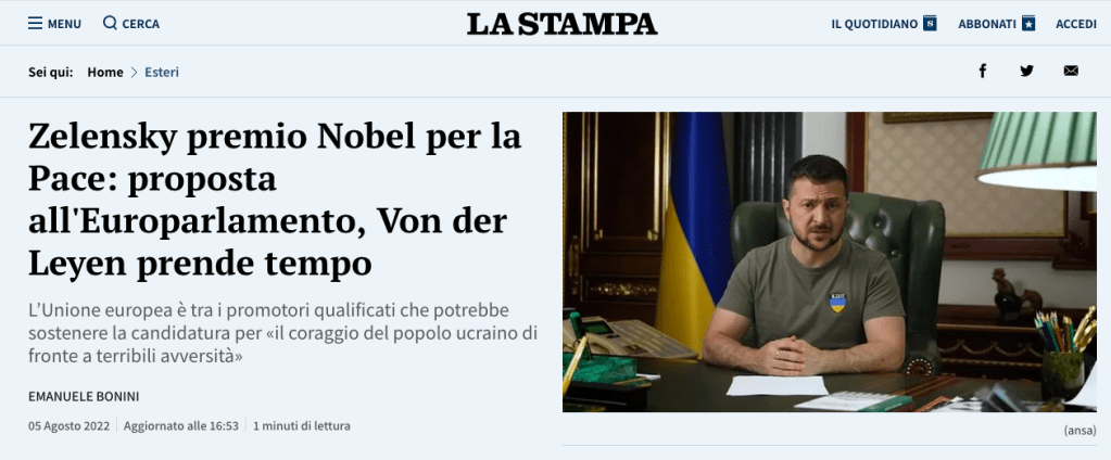 Fonte: quotidiano cartaceo del 7 ottobre 2022. Un’altra proposta al Nobel per gli omicidi – Il risultato della distorsione lessicale
