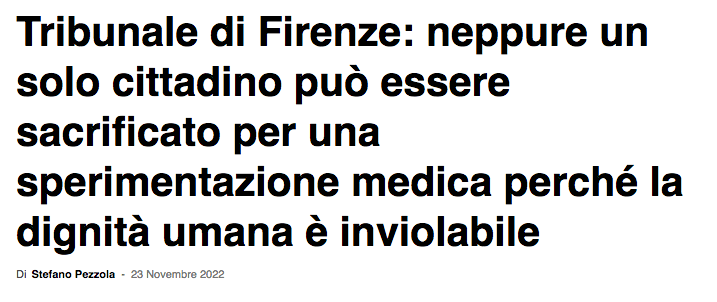 L’avvocato menziona e basa la sua stesura sull’articolo 1 della Carta di Nizza – Neanche un solo cittadino europeo può essere, quindi, sacrificato per una sperimentazione medica, o per altri motivi, perché la dignità umana è inviolabile.