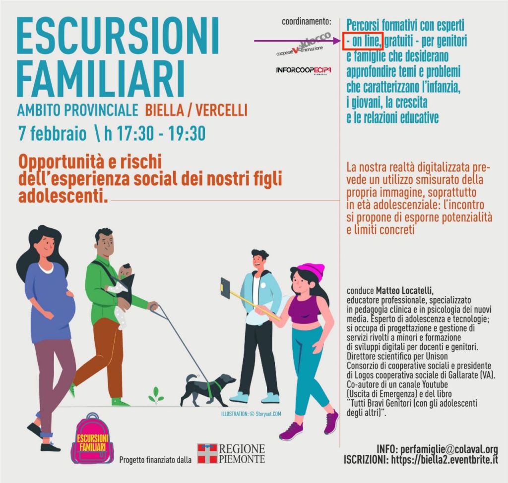 Quella che vedete qui di fianco è la pubblicità di un evento intitolato “OPPORTUNITÀ E RISCHI DELL’ESPERIENZA SOCIAL DEI NOSTRI FIGLI”. Il grassetto è voluto.