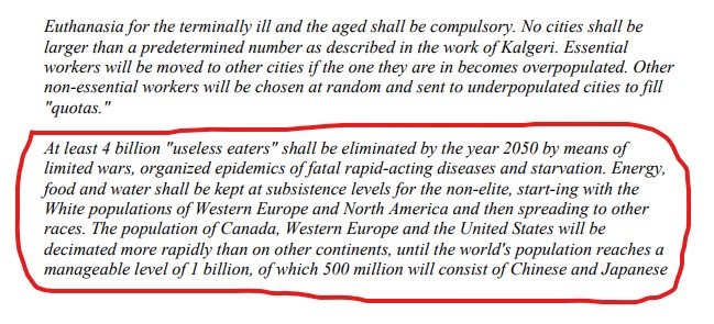 «Almeno 4 miliardi di “mangiatori inutili” saranno eliminati entro l’anno 2050 per mezzo di guerre limitate, epidemie organizzate di malattie mortali ad azione rapida e fame.