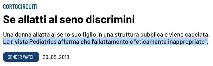 Il pezzo qui sopra riportato prende a esempio ciò che è accaduto dopo la scandalosa azione di una donna che, qualche anno fa in una struttura pubblica, si è permessa di allattare il proprio pargolo. Parla di un articolo apparso sulla rivista “Pediatrics” citata qui sotto e datato 1 aprile 2016 (non è uno scherzo…) e che vale la pena leggere alla luce di quanto accade. Reazione verso la donna criminale? È stata allontanata dalla struttura, naturalmente.