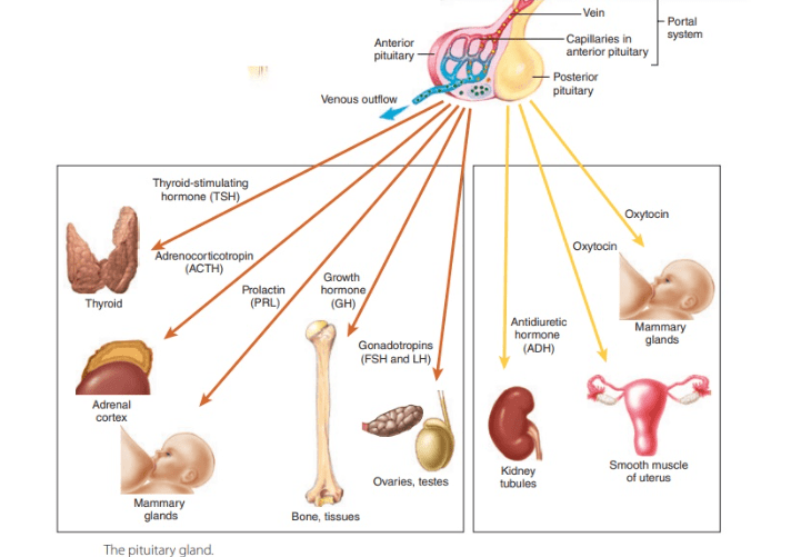 L’Adenoipofisi secerne gli ormoni mestruali, l’ormone tiroideo, l’ormone della crescita, la prolattina ed il cortisolo.