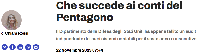 Il risultato non è una sorpresa, secondo Defense News dal momento che “le attività del Dipartimento della Difesa sono vaste e decentralizzate, ammontano a 3,8 trilioni di dollari a cui si aggiungono 4 trilioni di dollari di passività. Questi si trovano in tutti i 50 stati e in oltre 4.500 siti in tutto il mondo”. (Fonte: https://www.startmag.it/innovazione/che-succede-ai-conti-del-pentagono/)