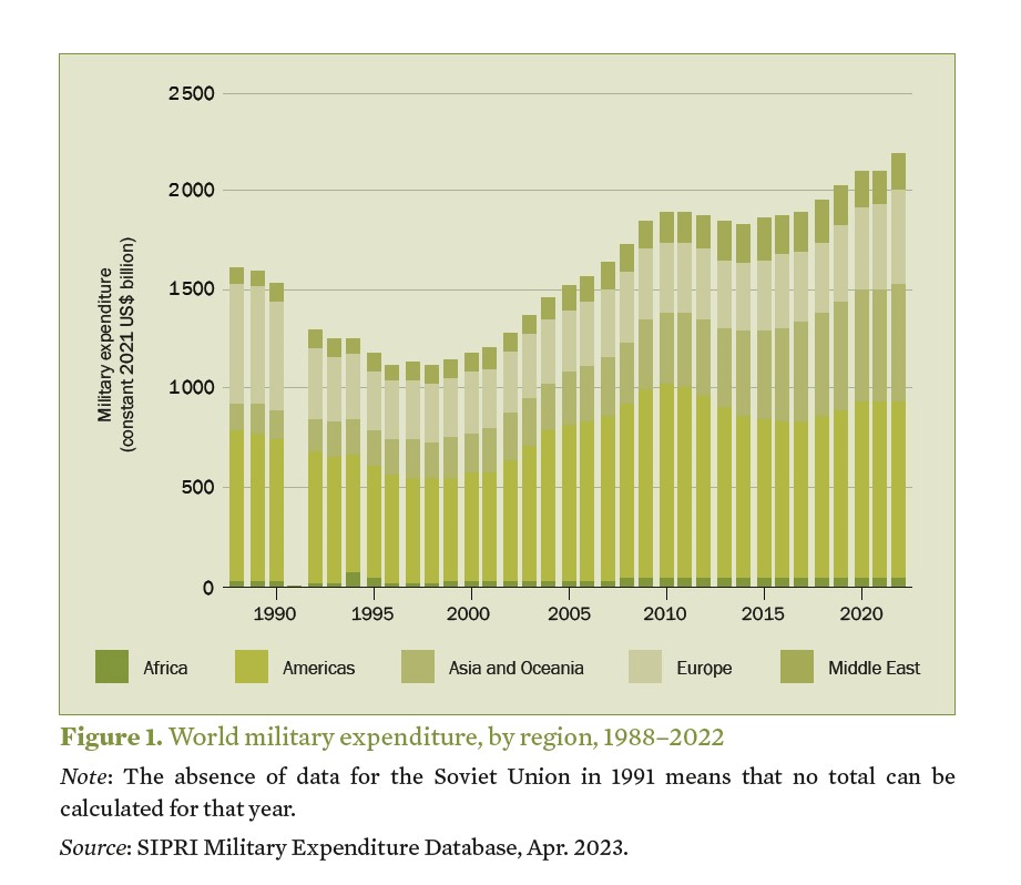 Costi pazzeschi, contabilità senza fondo e senza chiari giustificativi, hanno innalzato gli esborsi raggiungendo cifre esorbitanti. Colpa (colpa?) la recente guerra in Ucraina. Nel grafico qui sotto si può vedere l’andamento degli investimenti in armi, in continua crescita.