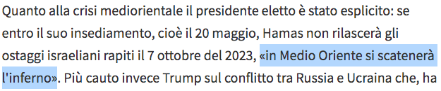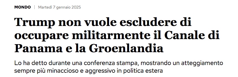 Ecco, lo sapevo, non abbiamo fatto in tempo ad esultare che… Taaac… Potrebbe esserci una opzione militare per la pacifica annessione. La stessa pacifica opzione sulla Palestina se Hamas (che pare sia una creazione dei servizi Statunitensi, ma è solo una mia ipotesi, eh), non rilascia immediatamente gli ostaggi Israeliani. Trump scatenerà l’inferno! Ha detto proprio così…