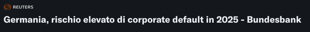 Sto recentemente leggendo commenti che riguardano il prossimo fallimento delle aziende della Germania dovuto all’enorme indebitamento e per ciò la Von der Leyen ha richiesto gli 800.000.000.000 di euro (scritto in cifre fa più impressione) per finanziare l’industria bellica tedesca e quindi salvare lo Stato teutonico.