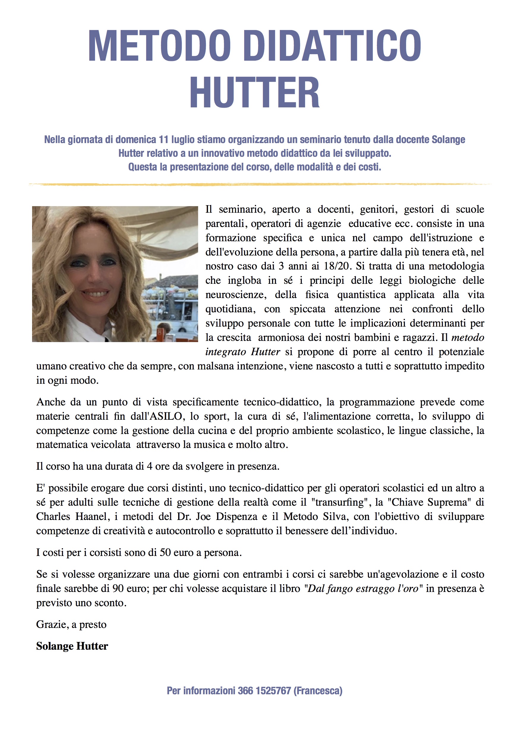Ha preceduto l’evento il pomeriggio informativo tenuto dalla docente Solange Hutter sul suo metodo didattico. L’evento si è tenuto a Miagliano domenica 11 luglio. Qui è possibile scaricare la nota informativa sul corso: