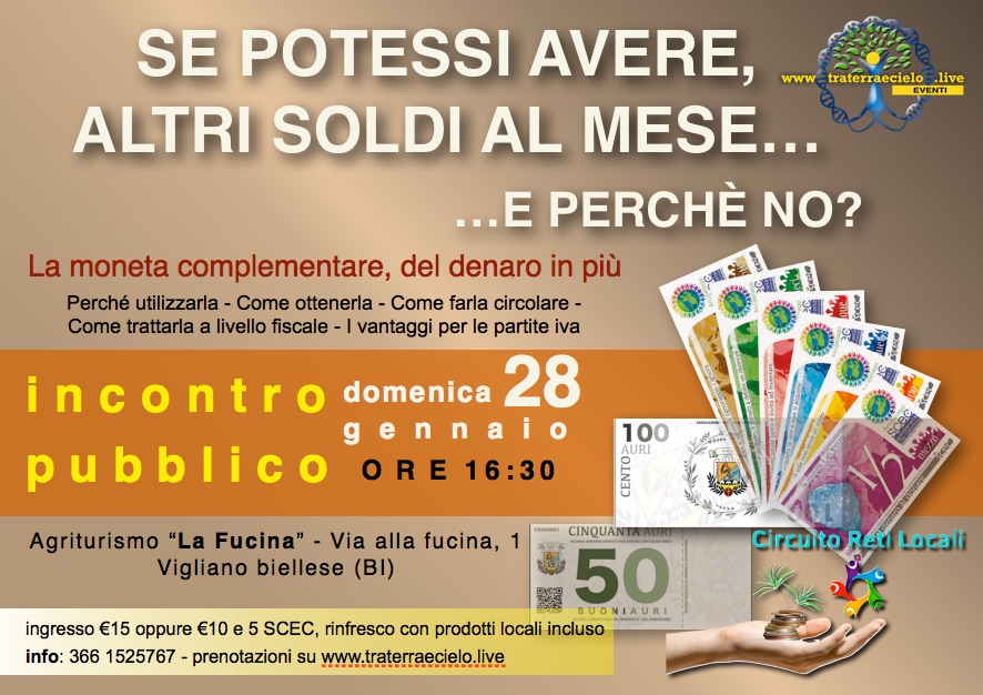 Di seguito il video integrale dell’evento con importanti e inedite informazioni sull’argomento “denaro e dintorni”. Abbiamo avuto ospiti online che sono intervenuti e che ringraziamo. Per il progetto RISO Elena Esposito – Per il progetto AURI Nico Arena (video allegato) – Per il progetto PROITALY (piattaforma di scambio tra monete complementari) Pierangelo Spazzoli – Per il progetto SCEC Luca Vanetiello
