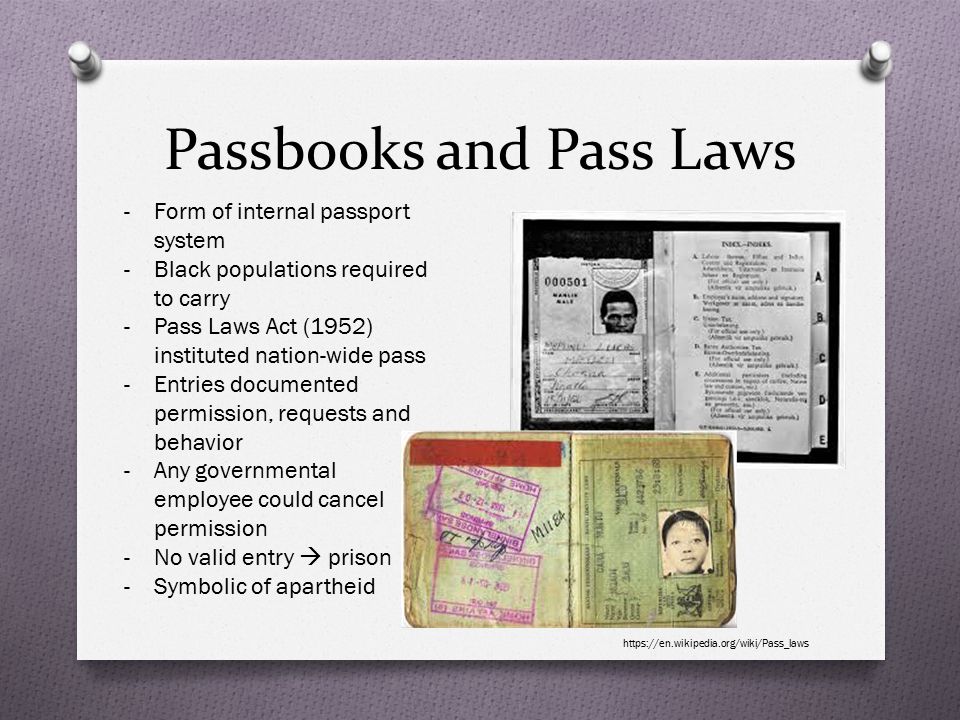 Form of internal passport system. Black populations required to carry. Pass Laws Act (1952) instituted nation-wide pass. Entries documented permission, requests and behavior. Any governmental employee could cancel permission. No valid entry prison. Symbolic of apartheid. https://en.wikipedia.org/wiki/Pass_laws.