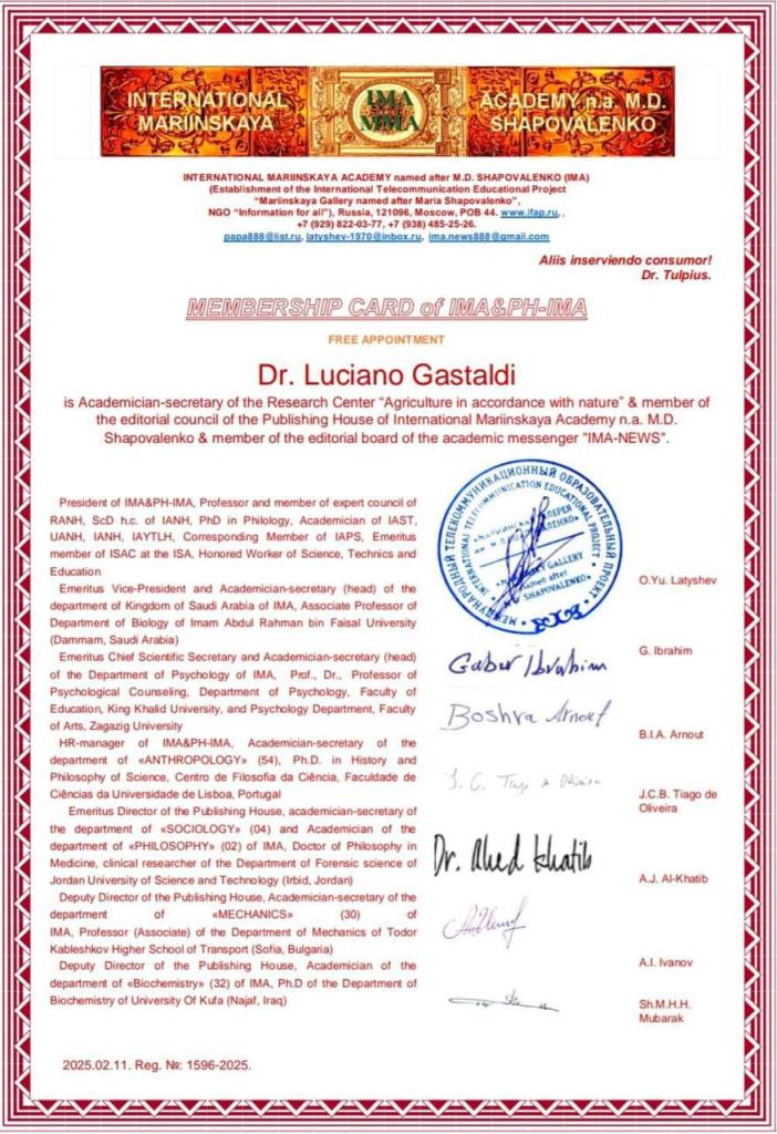 Sono fiero di annunciare che, da febbraio, il Dottor Gastaldi – ideatore della 𝗧𝗲𝗰𝗻𝗼𝗹𝗼𝗴𝗶𝗮 𝗦.𝗠.𝗧.© – è stato nominato 𝗔𝗰𝗰𝗮𝗱𝗲𝗺𝗶𝗰𝗼 𝗜𝗠𝗔 (International Mariinskaya Academy, Moscow).