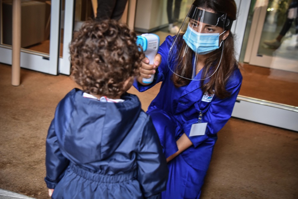 Il controllo della temperatura a mamme e bimbi all’ingresso dell’asilo – Primo giorno di apertura all’asilo nido di via Demetrio Stratos a Citylife – Milano 7 Settembre 2020 Ansa/Matteo Corner